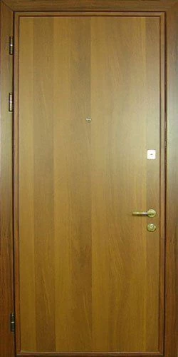 Ламинат - это доска из ДВП толщиной 4-5 мм с четырехслойным покрытием. Визуально он не отличается от натуральной древесины. Рисунок ламинированной доски может быть гладким и имитировать древесный спил или рельефным, имитирующим структуру дерева. Разнообразная цветовая гамма этого материала позволяет изготовить дверь, которая будет отлично смотреться в интерьере как квартиры, так и офиса.